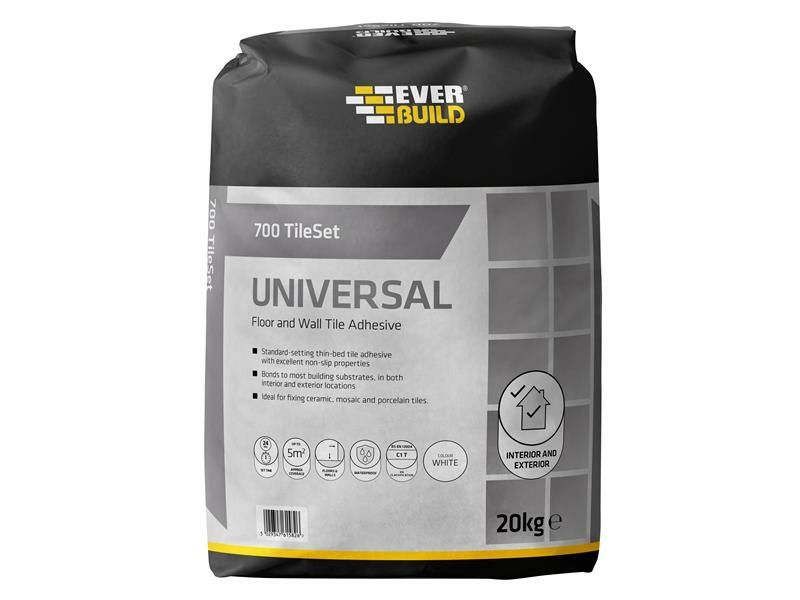 Everbuild 700 TileSet Universal is a standard setting tile adhesive, ideal for when an extended opening time is required. Suitable for fixing ceramic, mosaic and natural stone tiles to semi-porous surfaces.