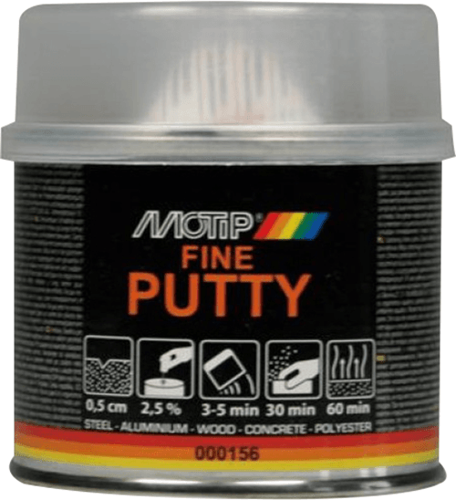 2 component fine putty to level small irregularities in surfaces of steel, aluminium, wood, concrete and polyester. Fine Putty is easy to sand, elastic and resprayable with all lacquer systems. Fine Putty has a very fine structure and excellent adhesion and is resistant to chemicals and weather influences. MoTip Fine Putty can be applied in layers with a thickness up to 0.5 cm.