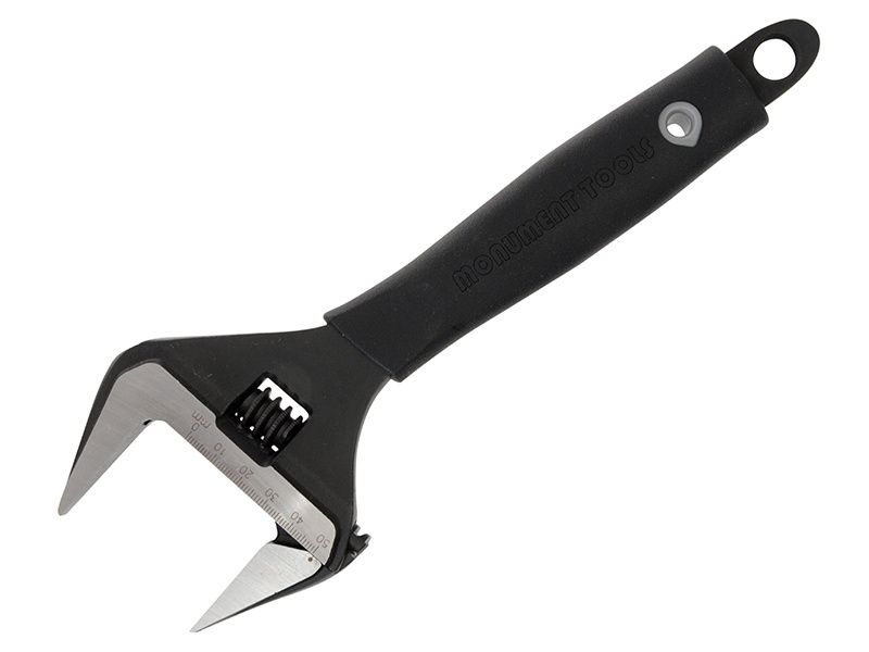 The Monument Wide Jaw Adjustable Wrench has a plastic rubber cushion handle, which is permanently adhered to the shank of the tool. Its soft, anti-slip material ensures a comfortable and strong grip.