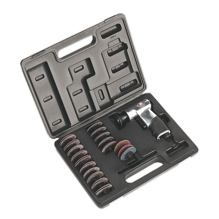 | Contents | Ø50mm Backing Pad, Sanding Discs; #60, #80, #120 Grit (10 of each), Surface Prep Pads; Fine, Medium, Coarse (1 of each) |