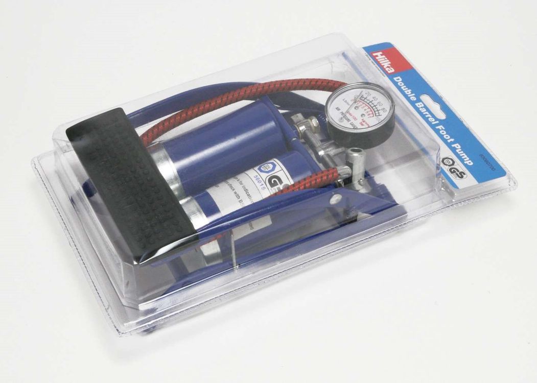 Double barrels make for quicker inflating. This TUV/GS approved pump has strong metal construction and comes with adaptors for bicycles and inflatables. Easy to read gauge shows psi and bar.