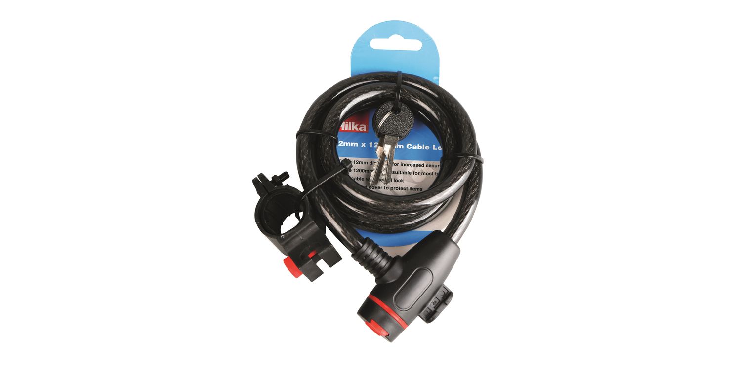 Thick 12mm diameter for increased security and large 1200mm length suitable for most tasks. Steel cable with keyed lock and vinyl coated cover to protect items.