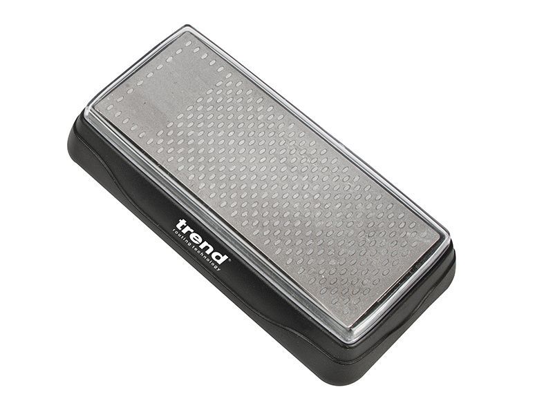Oval holes design on fine side to collect and hold metal residue. Fine side also has clear solid area for small tools. Ideal for site and workshop. Use with plane irons and chisels. Suitable for all hand tools. Recommended for use with Trend lapping fluid to prevent clogging or rusting and assist in keeping tools clean.