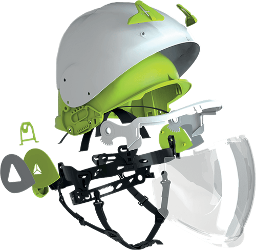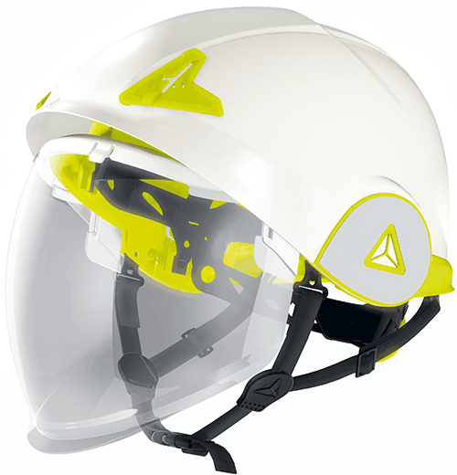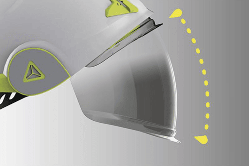 ABS dual shell safety helmet with polycarbonate retractable visor. Includes a microfibre protective storage bag.