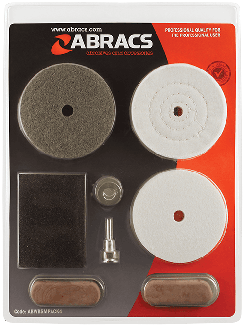 Contents: 1x 100 mm buffing wheel, 1x 100 mm felt wheel, 1x 100 mm non-woven wheel, 1x sponge block, 2x polish blocks and 1x drive arbor.