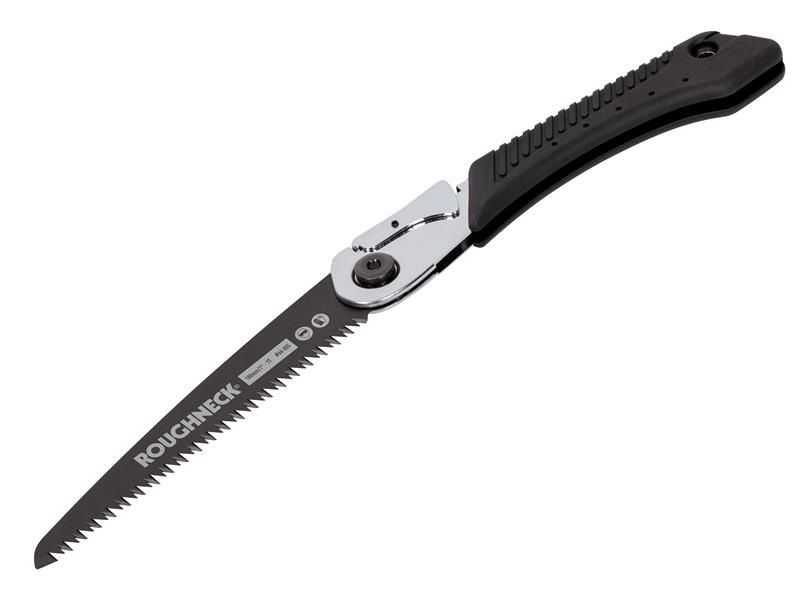 The Roughneck GORILLA® Fast Cut Folding Pruning Saw features impulse-hardened, triple ground teeth and PTFE low friction coating for exceptional cutting performance. With a chrome plated steel chassis for increased strength and durability. The blade securely locks in place and folds away safely when not in use.
