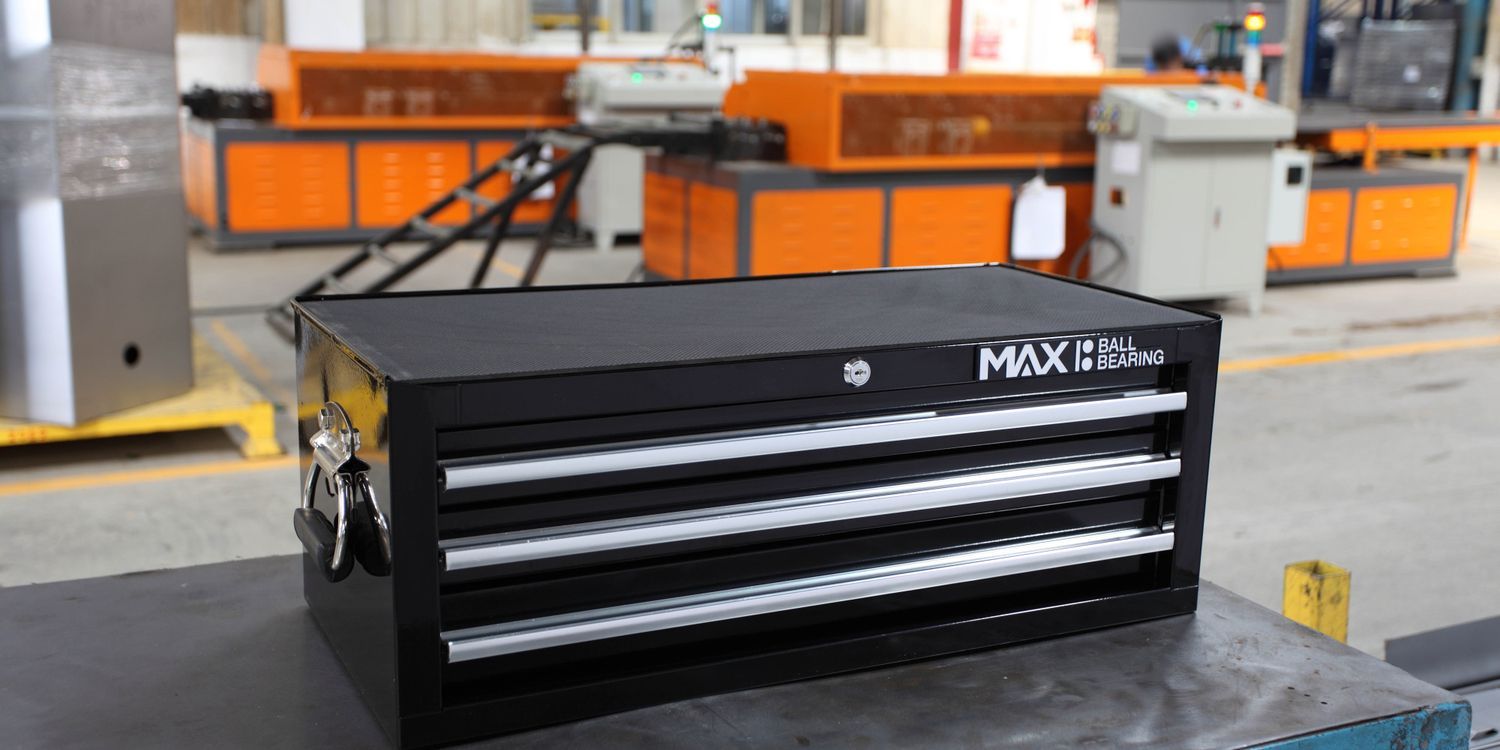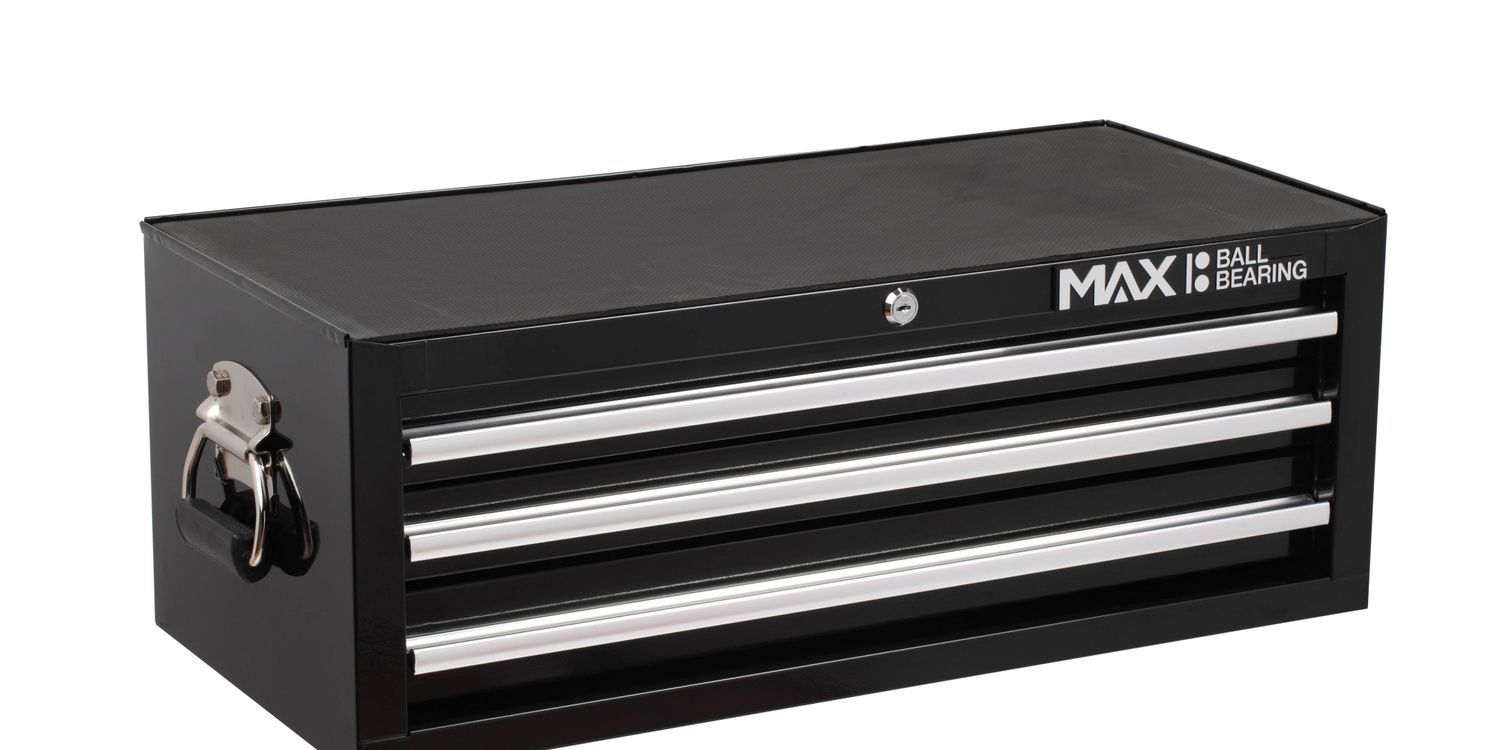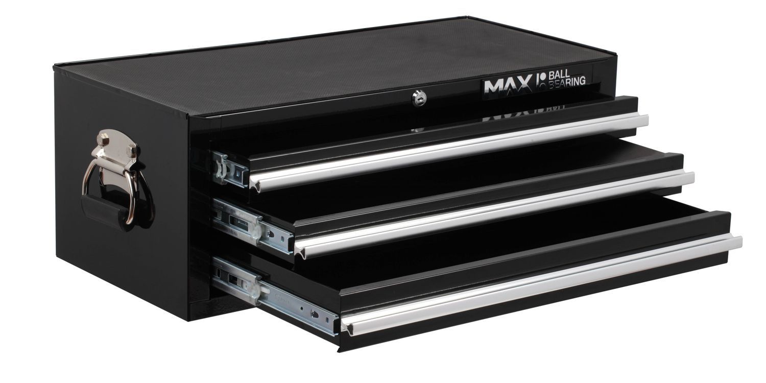 Heavy duty all steel construction with ball bearing slides and positive stop. Reinforced base comes with protective drawer liners, keyed locking mechanism, full length aluminium drawer pulls and chrome side handles. Overall dimensions: width 672 x depth 310 x height 249mm. Large drawer: 575 x 265 x 66mm, 2 medium drawers: 575 x 265 x 51mm.