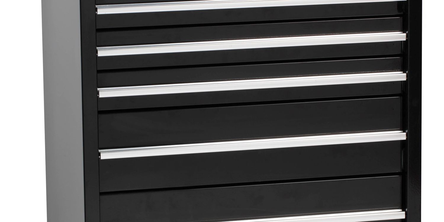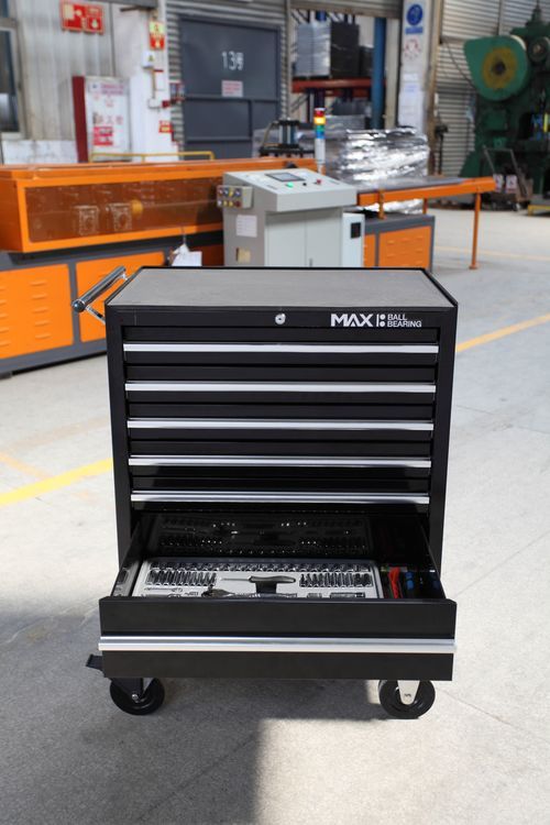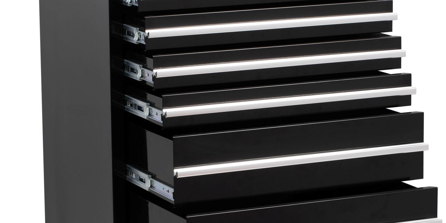 Extra-high, heavy duty all steel construction with ball bearing slides with positive stop. 5" casters with reinforced cabinet base comes with protective top mat and drawer liners. Keyed locking mechanism full length aluminium drawer pulls, chrome side handles and lockable casters. Overall dimensions: width 685 x depth 465 x height 955mm, 2 large drawers: 584 x 380 x 153mm, 5 medium drawers: 584 x 380 x 74mm.