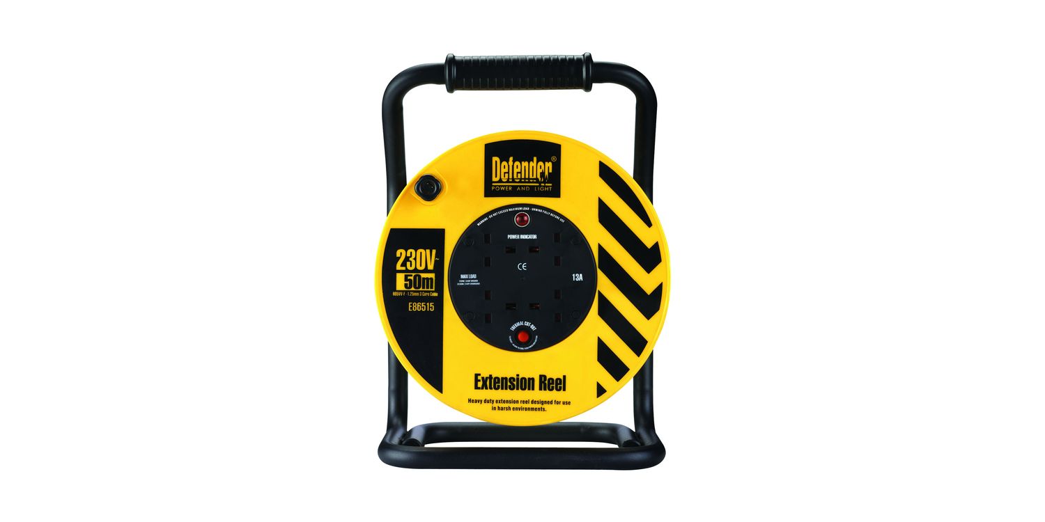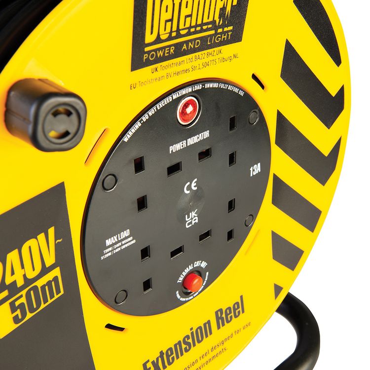 Heavy duty 13A 4-way reel with strong steel frame for a stable, secure base. Thermal overload protection prevents overheating. 15m VDE approved 1.25mm 3-core cable and 4 x 240V sockets.