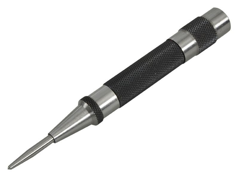 Rugged steel centre punch has a mechanism which automatically strikes a blow when downward pressure is applied. Force of blow is regulated by the adjustable knurled cap. No hammer is required.