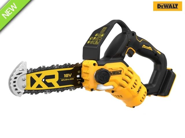 DEWALT DCMPS520 XR Pruning Saw with a powerful brushless motor giving higher performance, compact size and extended service life. Automatic oiling reduces maintenance requirements. Its two handles with additional hand protection increase user safety whilst providing better control of the saw. Other features include a safety switch-on lock, metal guard to reduce kick-back against hitting fences or walls plus the guard protects the chain from an ingress of dirt.