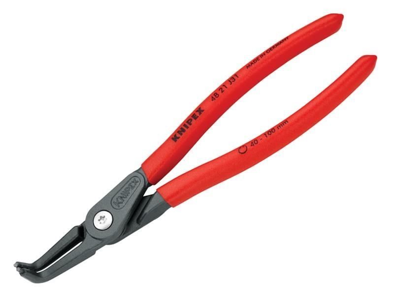 These Knipex 48 21 series internal circlip pliers with 90° bent tips are ideal for confined areas. With the slim head style design, they are constructed from chrome vanadium electric steel forged with precision non-slip tips for added strength and durability.