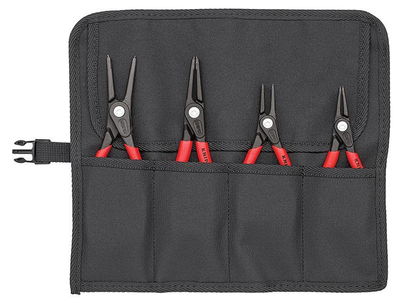 The Knipex 00 19 57 Circlip Pliers Set contains four circlip pliers which are supplied in a handy tool roll which is made of hard-wearing polyester fabric with a practical, adjustable quick release fastener.