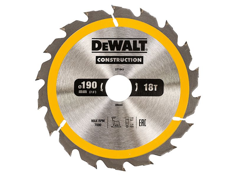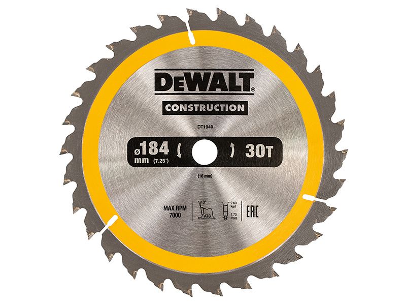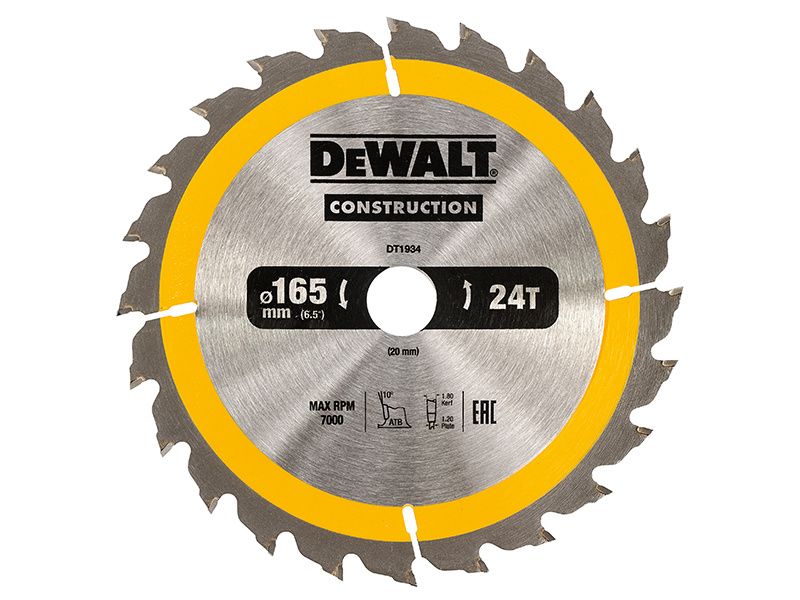 DEWALT Construction Circular Saw Blade for use with portable machines to cut softwoods and composite materials. The impact resistant carbide teeth help to reduce the chance of chipping or breaking a tooth. With ultra-sharp cutting edges and Alternate Top Bevel (ATB) teeth to reduce splinters.