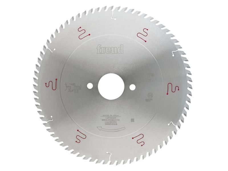 The Freud Multi-Material Saw Blade for horizontal panel sizing machines. Its Silver I.C.E.® (Industrial Cooling Element) Coating leaves a slick surface on the blade body that reduces heat and drag, enabling the blade to last longer. Designed for industrial panel sizing, single or multiple panels. Suitable for laminated chipboard and MDF, thermoplastic composites, HPL and Plexiglas.