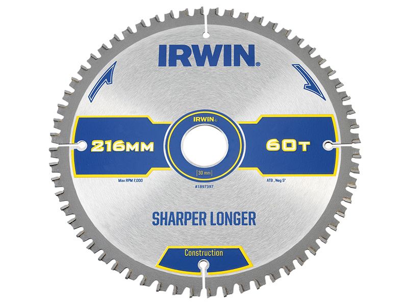 The Irwin Construction Table & Mitre Circular Saw Blade with welded carbide teeth for a stronger tooth bond and longer life. The ultra compact carbide is up to 70% tougher than standard carbide for superior sharpness and cut quality.
