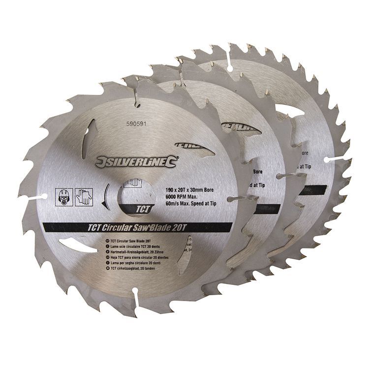 Packs of 3 circular saw blades suitable for hardwood, softwood, chipboard and other composite materials. Hardened and strengthened to ensure a long life. 20, 24, 40 tooth.