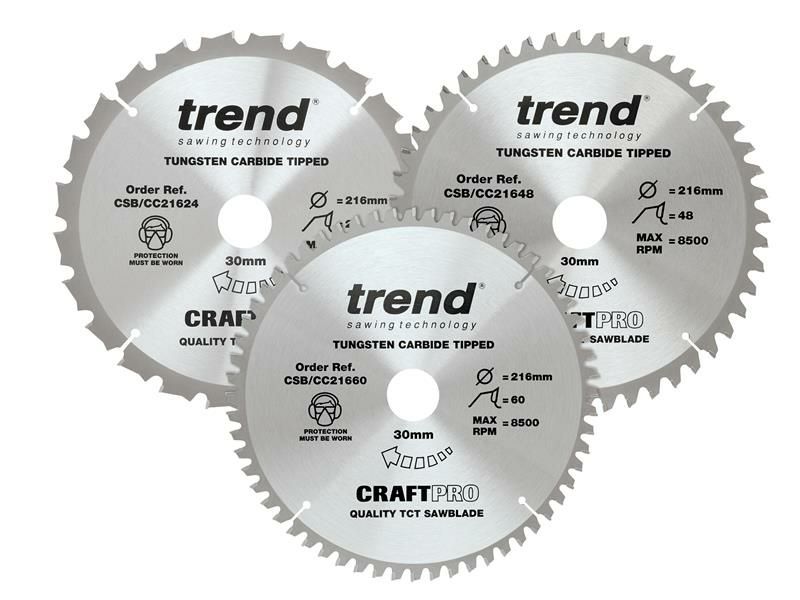 This Trend CraftPro Mitre Saw Blade Triple Pack contains a selection of same diameter Tungsten Carbide Tipped circular saw blades designed for a professional finish in hardwood, exotic rip, plywood rip, crosscut, softwood rip and chipboard laminated one-sided.
