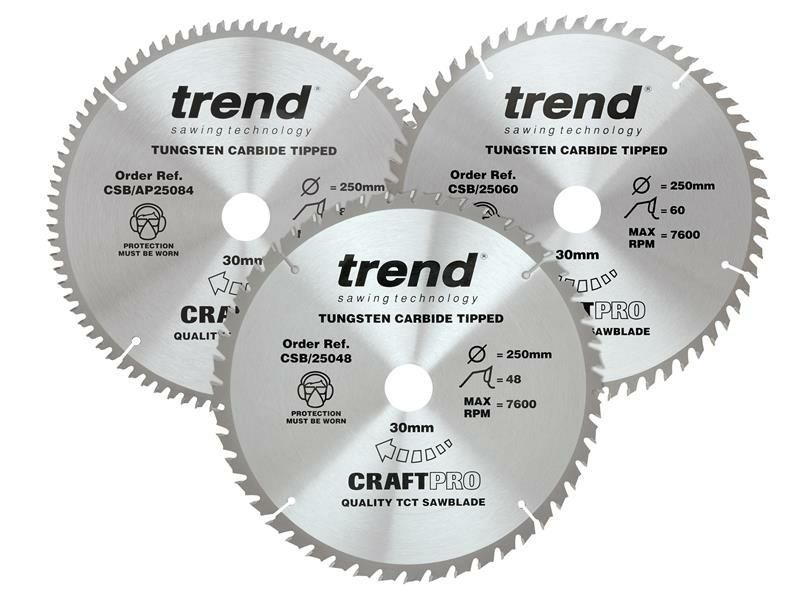 This Trend CraftPro Table Saw Blade Triple Pack contains a selection of same diameter Tungsten Carbide Tipped circular saw blades, designed for a professional finish in hardwood, exotic rip, plywood rip, crosscut, softwood rip and chipboard laminated one-sided.