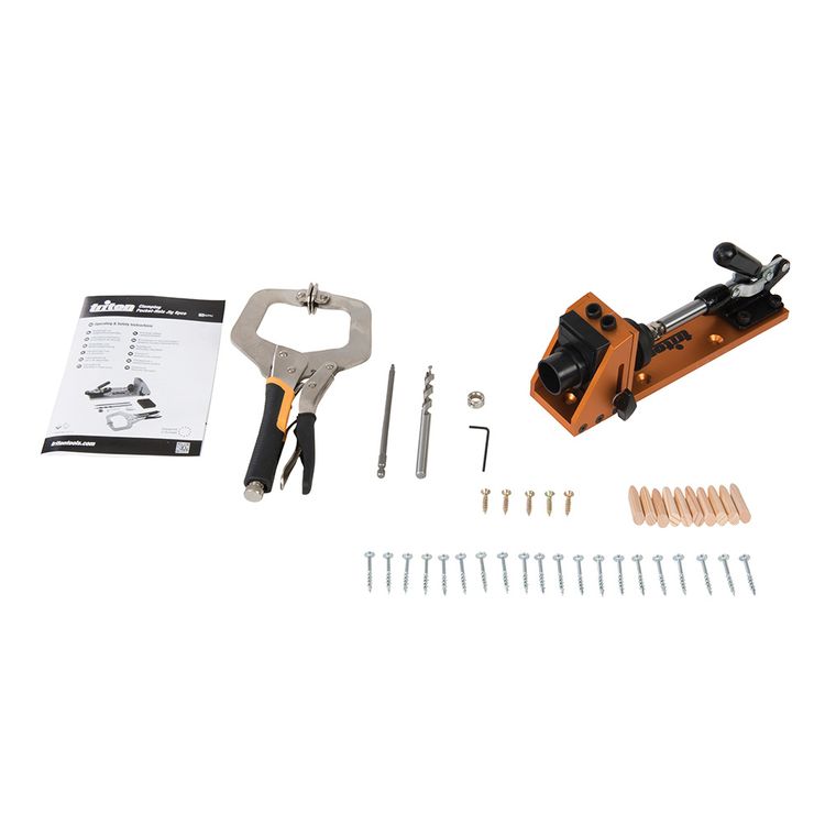Hardened steel drill guide with 2-drill fixed spacing. Removable drill guide for benchtop or mobile use. 3mm (1/8") incremental settings for 12mm (1/2") to 38mm (1-1/2") thick material. Kit includes Triton Pocket-Hole Jig, Step Drill Bit, Collar and Key, screws, pine plugs, Pocket Hole Jig Clamp, Square Drive Bit 152mm (6"), bench fixings and instruction sheet.
