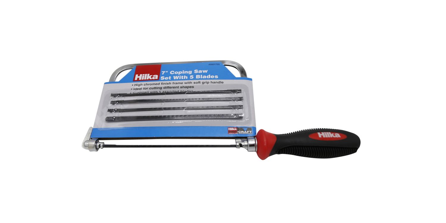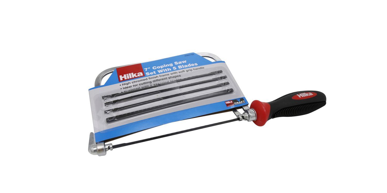 Heavy duty steel frame with soft grip handle. Supplied with 5 assorted blades. Packaged in a display card.