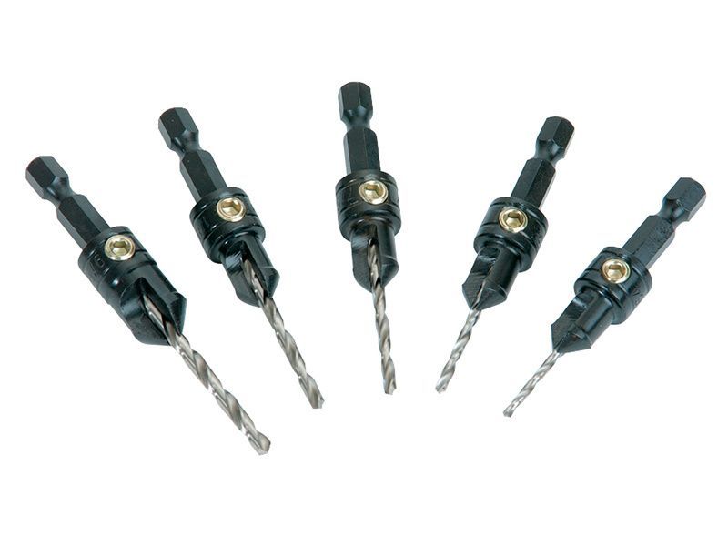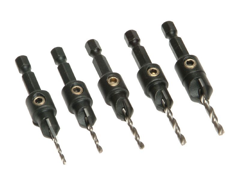 The Trend Countersink Set contains five heat treated tool steel countersinks with hex shafts. They are fitted with High Speed Steel drill bits to cover the full range of screw sizes and are self clearing.
