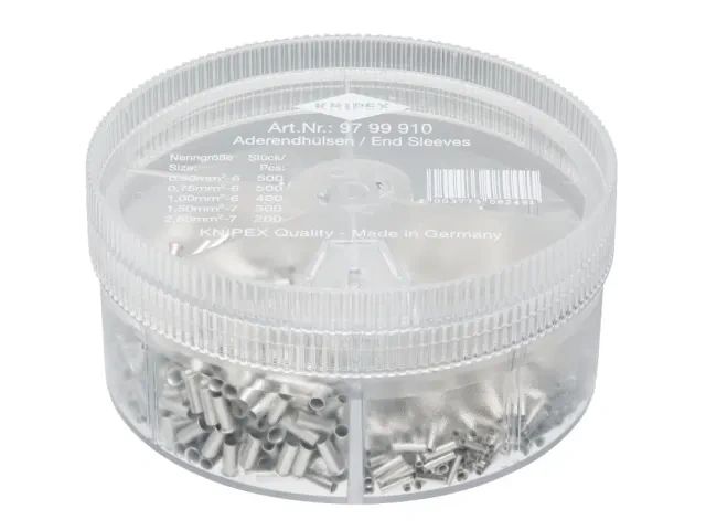 Contents: 500 Wire Ferrules 0.5mm², 500 Wire Ferrules 0.75mm², 400 Wire Ferrules 1mm², 300 Wire Ferrules 1,5mm², 200 Wire Ferrules 2,5mm².