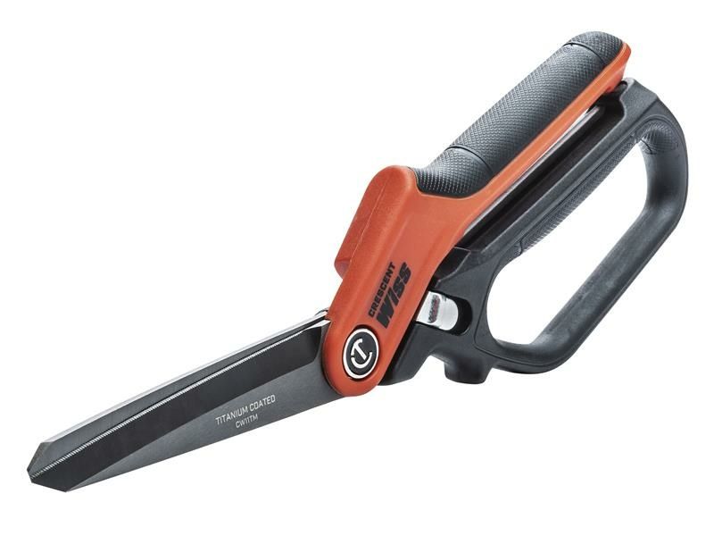 Crescent Wiss® Spring-Loaded Tradesman Shears feature premium steel blades that extend through the handles for twice the strength and 10x the cutting power of standard shears. The titanium blade coating is 3x harder than steel providing increased durability and longer edge life. A serrated bottom blade grips material for better control and cleaner cuts.