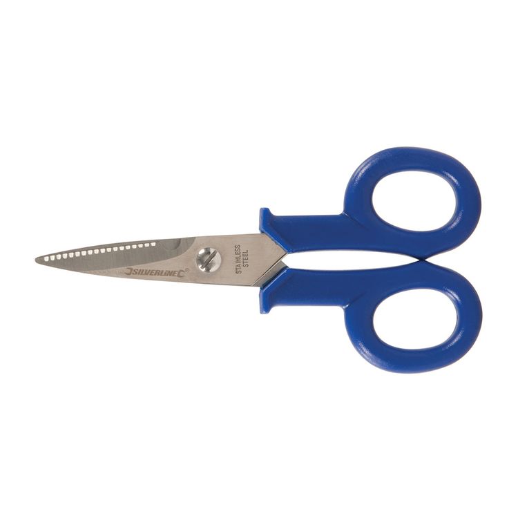 Heavy duty shearing scissors with serrated lower blade and integrated notch for cable stripping. Cuts iron wire up to 5mm diameter. Centre adjustment screw for tightening or removing blades for sharpening. Ideal for thin section wire, small diameter cable, fibre optic cable, insulation, leather, plastic tubing, string, cord and thread. Blade length 40mm.