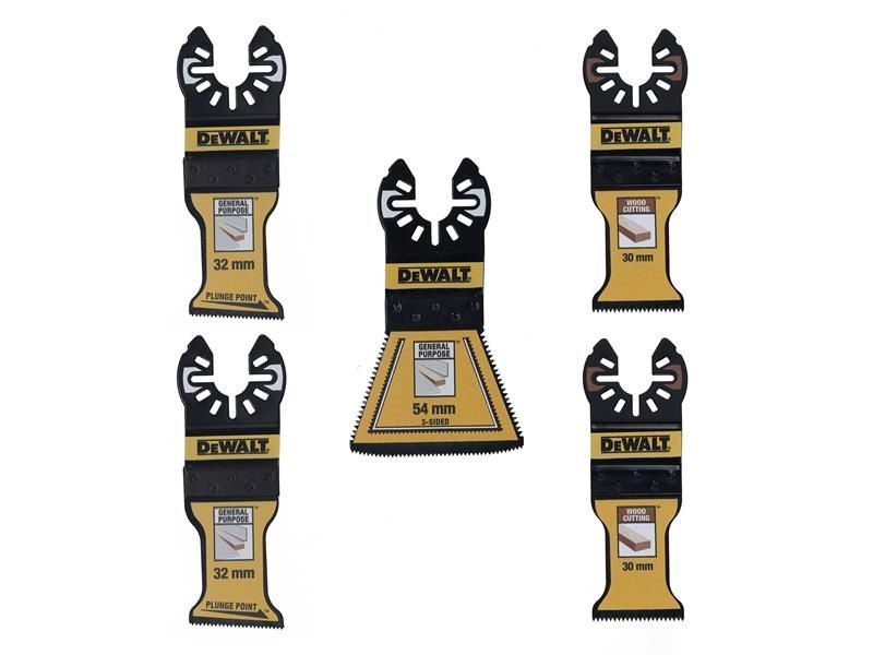 The 5 Piece DeWALT DT20777 Mixed Multitool Blade Set. The blades are made from SY090 high-speed steel and finished with a next-generation TiN bi-metal coating. Durable ink-jet markings keep size and material information clearly visible. Universal fitment allows you to clip straight onto leading multi-tools from DeWalt, Fein, Milwaukee, Makita and Bosch.