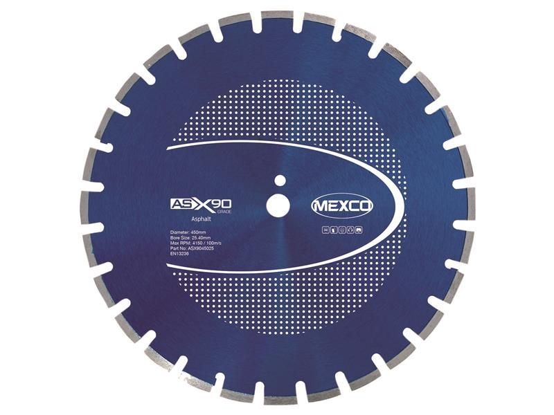 The MEXCO Asphalt X90 Grade Diamond Blades have been developed to offer a longer cutting life. Designed for users cutting on a more regular basis, or a one-off job which lasts more than several cuts. The blade is manufactured using the latest techniques such as undercutting protection and laser welded segment attachment.