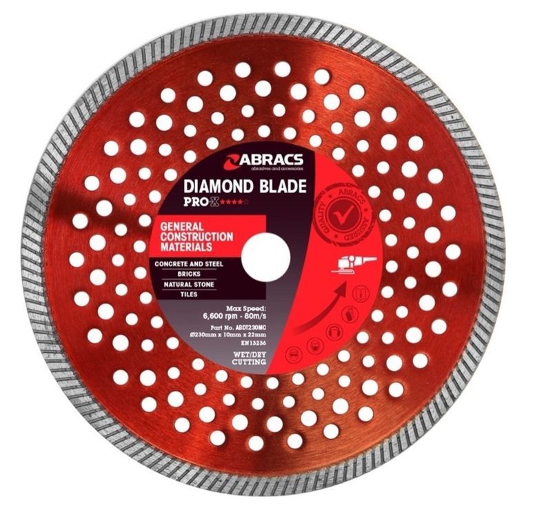 • Abracs Pro-X General Construction Materials Diamond Blades are designed for maximum performance and long life. Suitable for cutting virtually all construction materials including steel and reinforced concrete. The 10mm continuous segment eliminates the chance of segment loss and cooling hole technology reduces cutting temperature and increases user visibility for enhanced safety. Manufactured using quality diamonds and a strengthened, pre-stressed metal body.