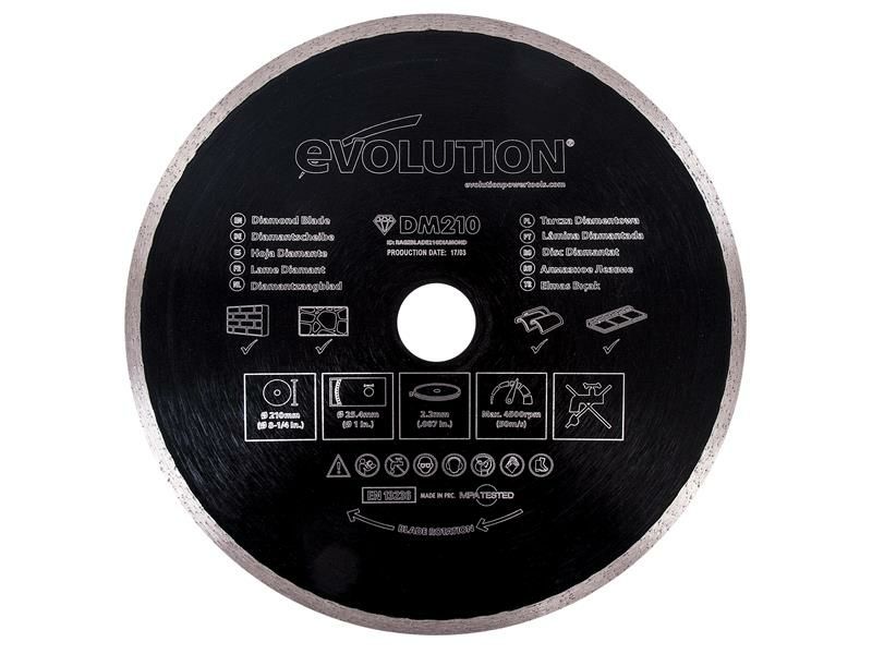 The Evolution RAGE® Diamond Blade enhances Evolution multipurpose saw’s versatility. It allows the machine to cut stone, concrete, roof tiles and slate. A durable blade which features a high concentration of diamond for longevity and a hot-pressed turbo continuous rim for a smooth cutting performance.