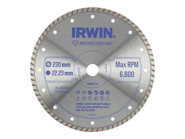 IRWIN® Diamond Blade 230 x 22.23mm for cutting stone, ceramic, tiles and granite. Fits all popular angle grinders.