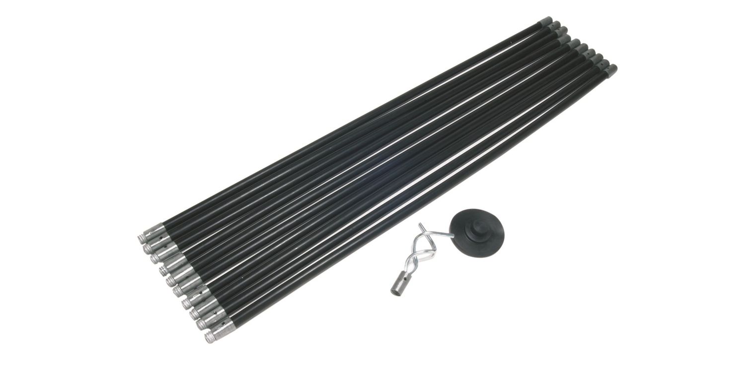 Suitable for clearing domestic drains. Comes with 10 rods, 100mm rubber plunger and 50mm double worm screw. Fits other accessories.