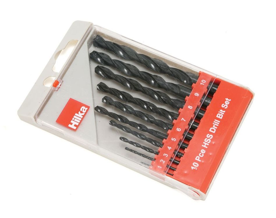 High quality HSS drills sizes: 1, 2, 3, 4, 5, 6, 7, 8, 9, 10mm. Black finish in plastic display case.