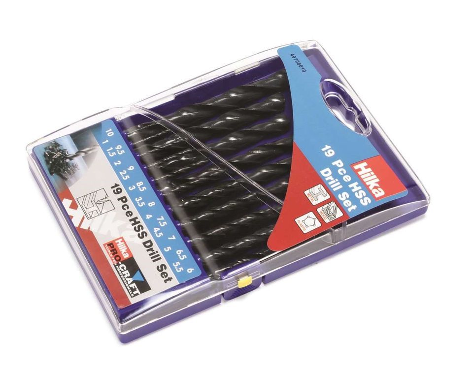 High quality HSS drills in carrying and display box, made to DIN standards. Sizes: 1, 1.5, 2, 2.5, 3, 3.5, 4, 4.5, 5, 5.5, 6, 6.5, 7, 7.5, 8, 8.5, 9, 9.5, 10mm.