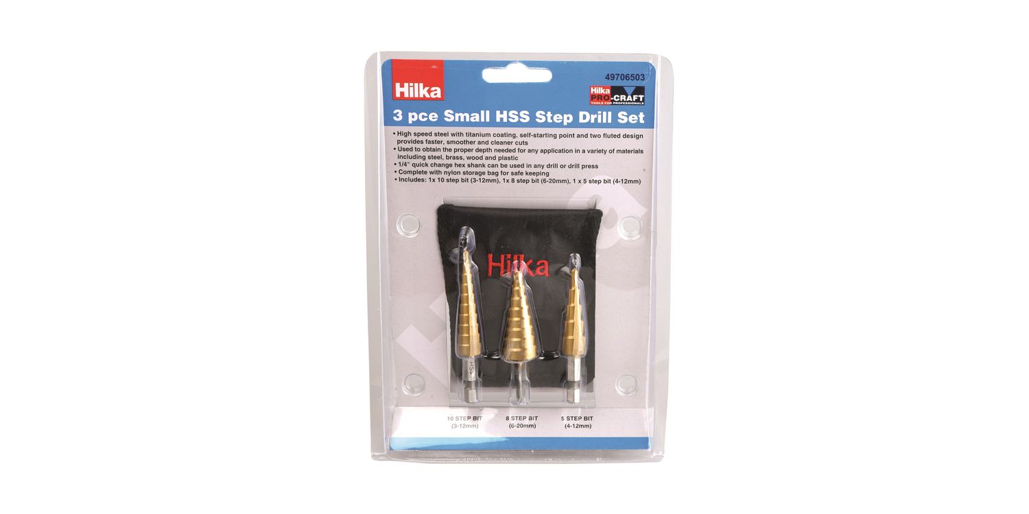 High speed steel with titanium coating, self-starting point and two fluted design provides faster, smoother and cleaner cuts. Used to obtain the proper depth needed for any application in a variety of materials including steel, brass, wood and plastic. 1/4" quick change hex shank can be used in any drill or drill press. Complete with nylon storage bag for safe keeping. Includes: 1x 10 step bit (3-12mm), 1x 8 step bit (6-20mm), 1 x 5 step bit (4-12mm).