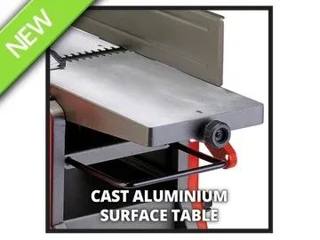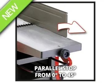 The planing dressing table of the stationary planer is made of sturdy aluminium and provided with an inclinable end stop. In addition to the solid construction, the vibration-damping feet also provide the necessary stability. The planer is also equipped with an overload switch and a zero voltage switch, which prevents the machine from unintentionally starting up after a power failure.