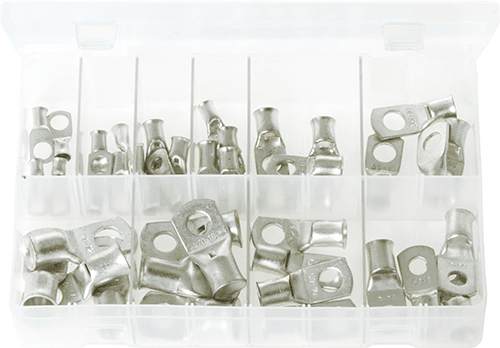 10 x Sizes (for Cable Size x Bolt Hole Size): 10 mm² x 8 mm, 16 mm² x 8 mm, 25 mm² x 6 mm, 25 mm² x 8 mm, 35 mm² x 8 mm, 35 mm² x 10 mm, 50 mm² x 8 mm, 50 mm² x 10 mm, 70 mm² x 10 mm, 70 mm² x 12 mm.
