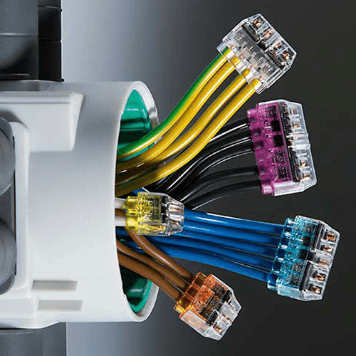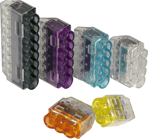 'Helacon' mini wire connectors are used for fast, easy and reliable connection and distribution of cable and conductors. Simply insert the cable completely into the connect. A double spring mechanism provides a secure installation and will support fitters especially in awkward situations like difficult-to-reach areas and overhead work. To change or correct a wire, simply hold and twist it left and right while pulling the connector.
