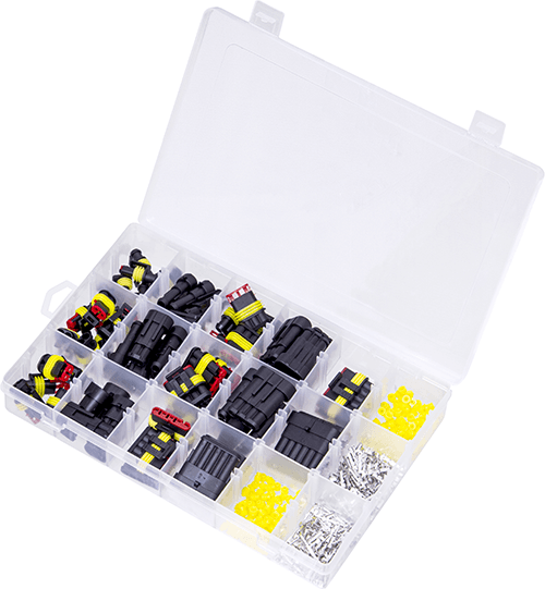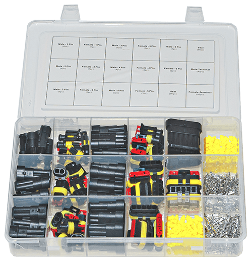 6 x 1-way Female. 6 x 1-way Male. 12 x 2-way Female. 12 x 2-way Male. 5 x 3-way Female. 5 x 3-way Male. 4 x 4-way Female. 4 x 4-way Male. 3 x 5-way Female. 3 x 5-way Male. 2 x 6-way Female. 2 x 6-way Male. 180 x Yellow Rubber Seals. 90 x 1.5 mm Female Pin. 90 x 1.5 mm Male Pin.