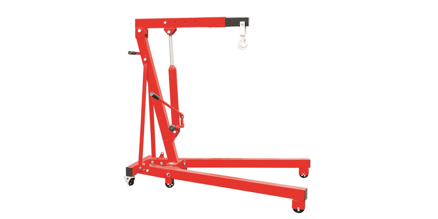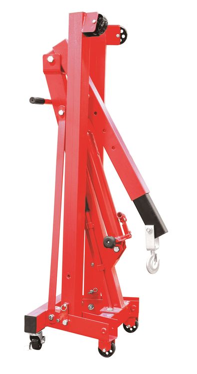 1 Tonne capacity with lifting positions 250, 500, 750 and 1000kg with lifting range 25 to 2100mm. All steel hydraulic engine crane for quick and safe lifting with swivel hook and 4 pre-set lifting positions. Foldable design allows for easy storage with sturdy castors to make it easy to move. The product width, length and height when folded is 637mm x 780mm x 1570mm, the unfolded position is 685mm x 1176mm x 1390mm. Width of legs 40mm. Lifting arm length range: 1/4 tonne position 702mm, 1/2 tonne position 612mm, 3/4 tonne position 522mm, 1 tonne position 432mm. Product weight 69.5kgs.