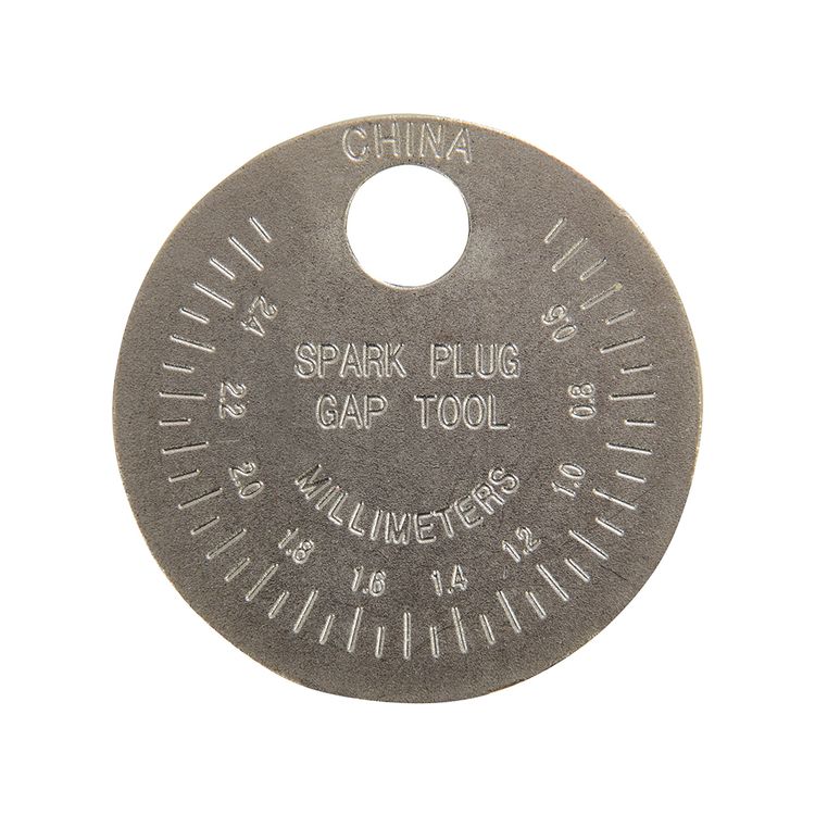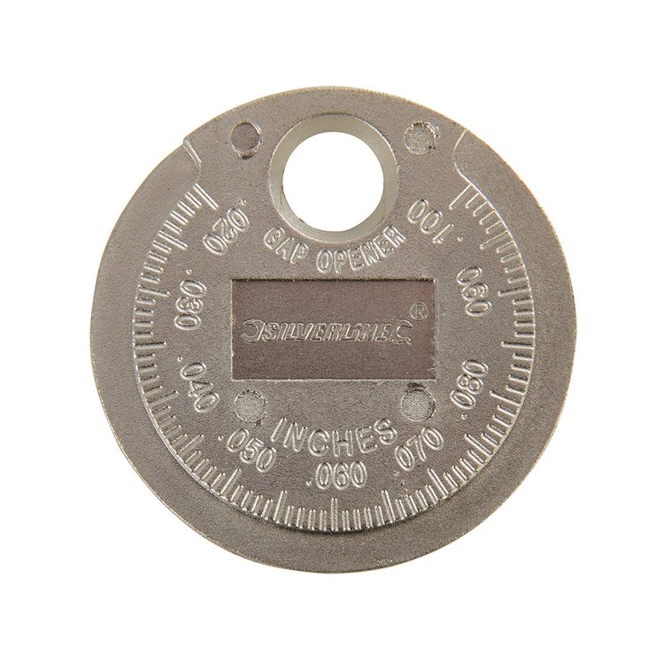 Coin-type tool with flanged hole to adjust the side wire without damaging the centre element and outer rim to measure the electrode gap. Metric 0.45 - 2.55mm, imperial 0.02 - 0.1". Solid alloy steel.