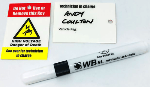 • Hi-vis warning printed in vibrant colours on one side with a panel on the reverse so the technicians name can be written along with vehicle registration no