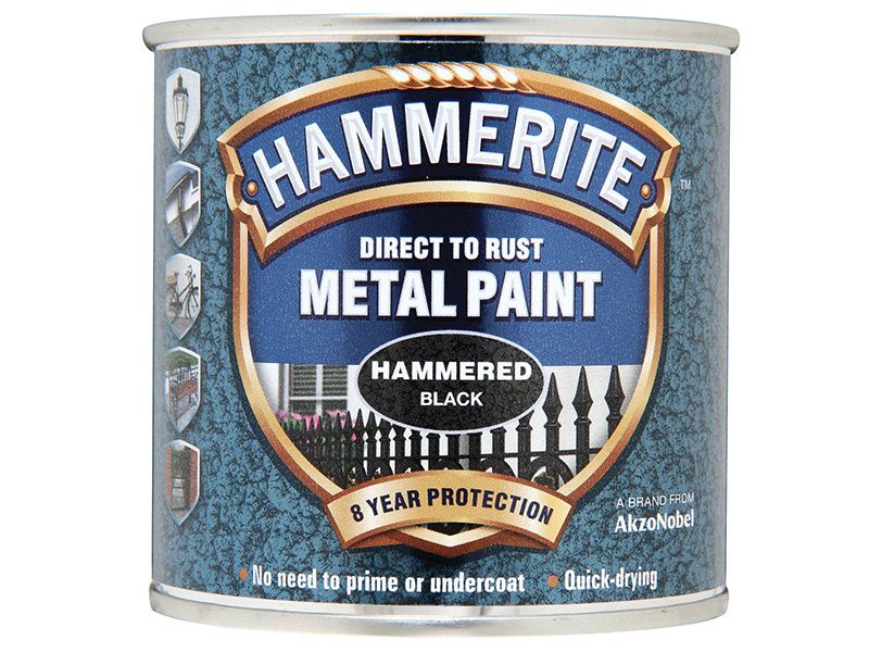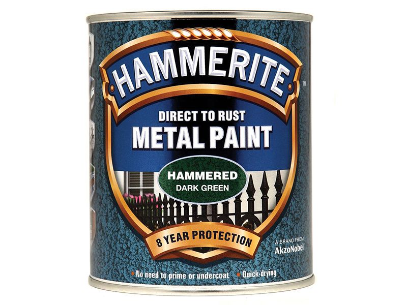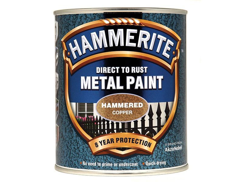 Touch dry in an hour, Hammerite is corrosion resistant and is suitable for use on a wide range of exterior metal including gates, railings, drainpipes, guttering and garden furniture. The paint has a subtle hammered effect with a metallic sheen.