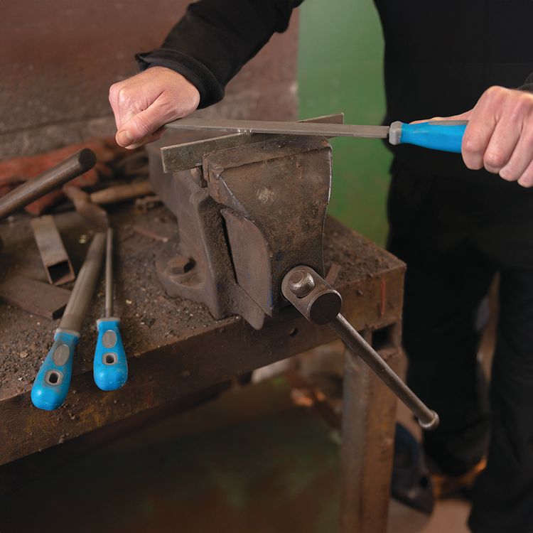 Includes flat, round and half-round second cut files. Soft-grip handles with hanging hole.