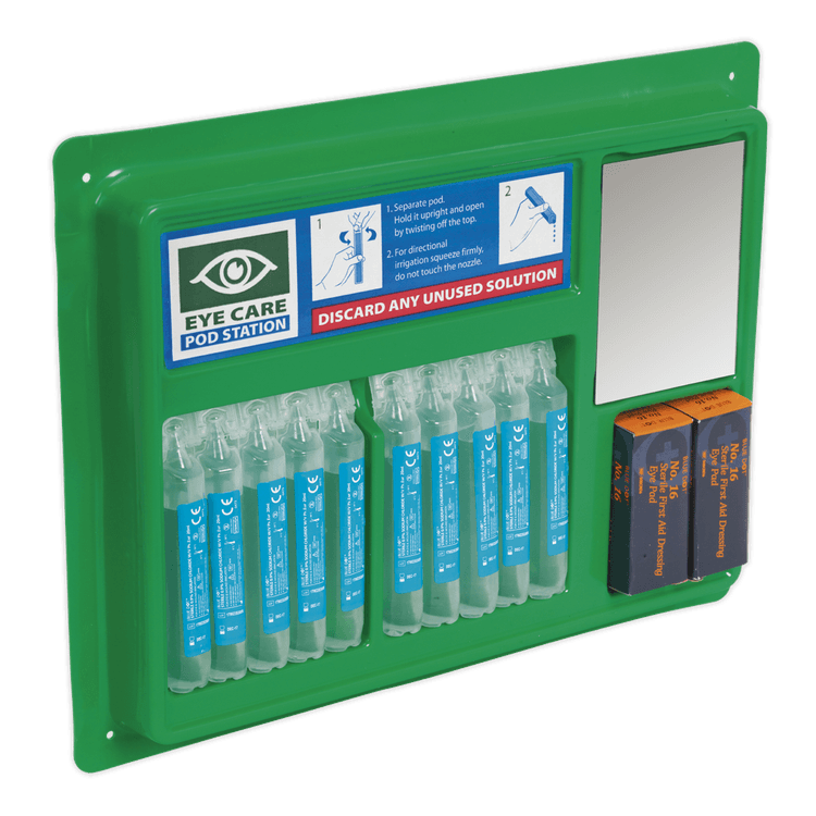 Keep essential first-aid provisions close at hand with the Sealey EWS02 Eye/Wound Wash Station. This compact unit includes ten 20ml sterile saline pods and two dressing eye pads, all housed in a durable plastic case. A shatterproof mirror allows for precise application, helping to flush out irritants or debris safely and quickly.