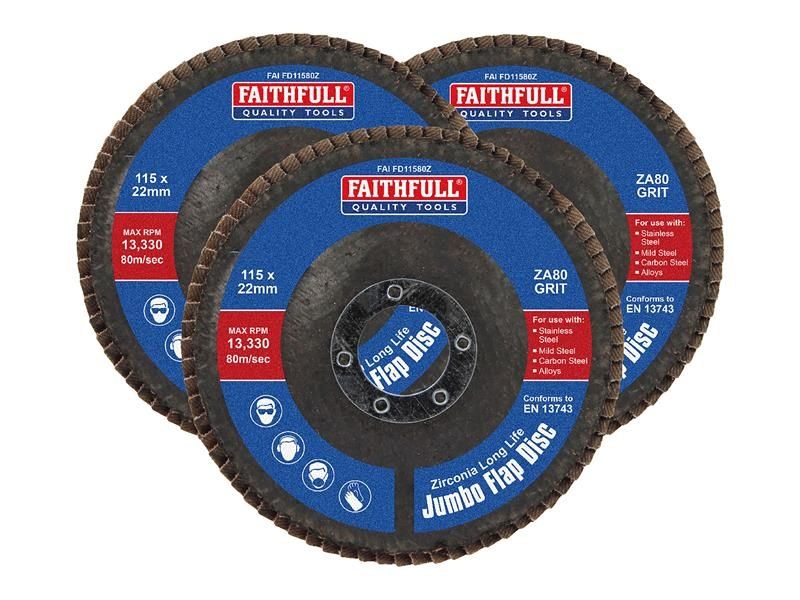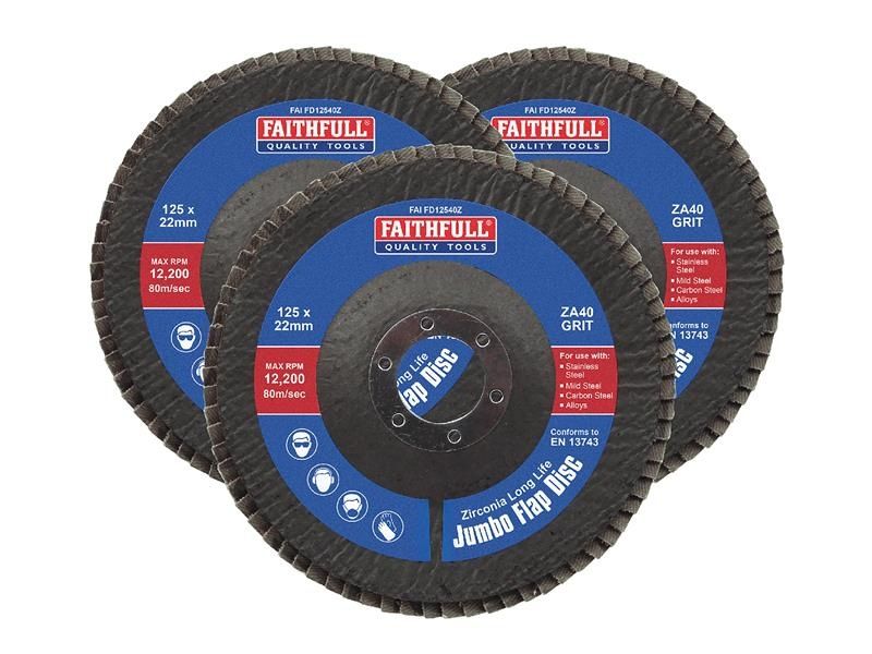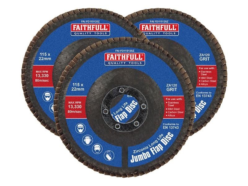 The Faithfull Zirconia Abrasive Jumbo Flap Discs are designed for use on angle grinders. Jumbo discs contain up to 40% more abrasive than standard flap discs. Manufactured from long lasting Zirconia Alumina and resin bonded for extra strength. Suitable for use on wood, metal, plastic and stainless steel. The slightly conical shape is ideal for grinding at 15–25 degree angles on contoured surfaces.