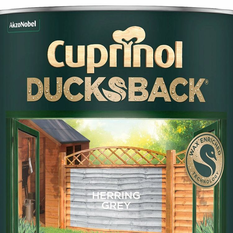 Give a decorative finish to sheds and fences with Cuprinol 5 Year Ducksback Herring Grey Exterior Paint. This Ducksback has an advanced, wax enriched and non-drip formulation, that colours and weatherproofs sheds and fences for up to 5 years. It is quick-drying, has a low odour and is safe to use around plants and pets. Pack size: 5L.